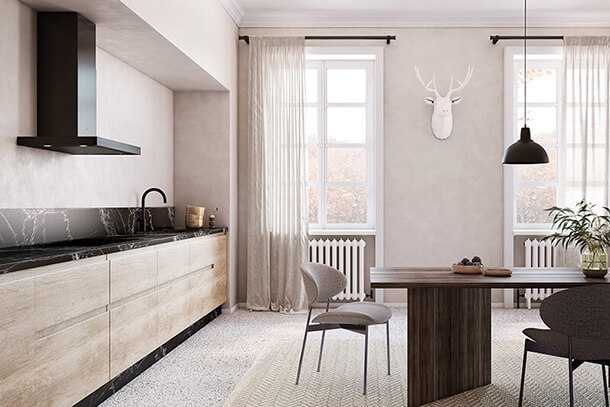 Grâce à la taille et à la légèreté de Dekton (320 x 144 cm environ), les possibilités de décoration pour les cuisines, les salles de bain, les façades, les murs ou les lieux à fort passage sont exponentielles.