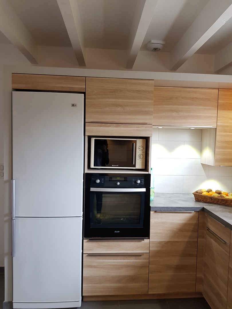 Nous sommes donc 2 semaines après la photo précedente. On peux y voir une belle différence, nous avons installé des meubles en bois clair, avec un plan de travail en stratifié gris qui se marie parfaitement avec le carrelage au sol.